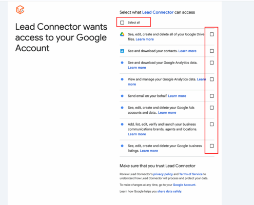 Google connection: Permissions missing warning