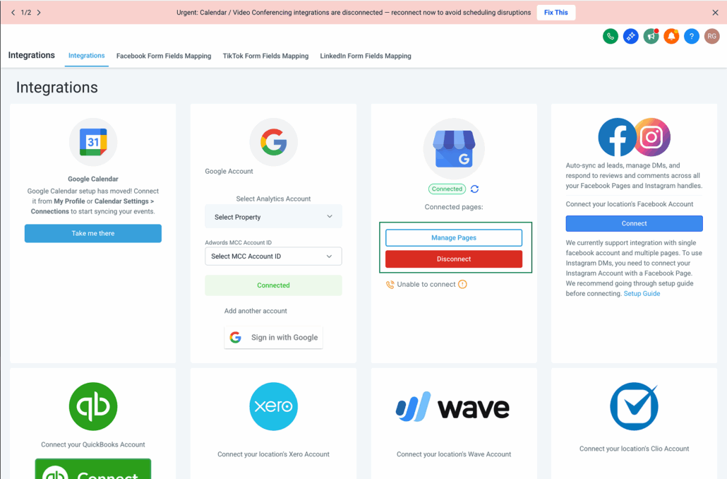 <li>Navigate to Integrations: Sub-account view → Settings → Integration → Google Business Profile card.</li>