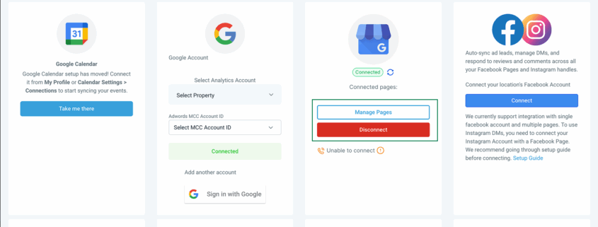 <li>Select your GBP page(s): Click Connect/Manage to view all GBP pages associated with the connected Google account.</li>