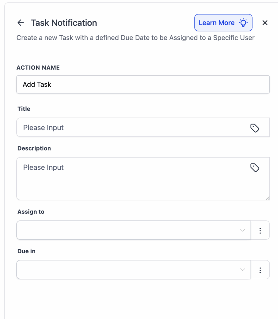 - In your workflow, add an action for ‘Add Task’ and set assignee, due date, and priority.