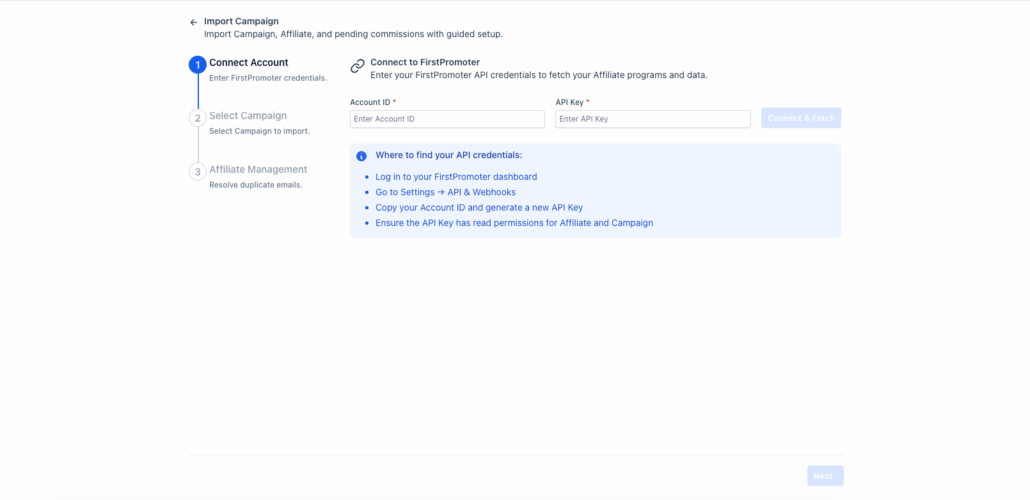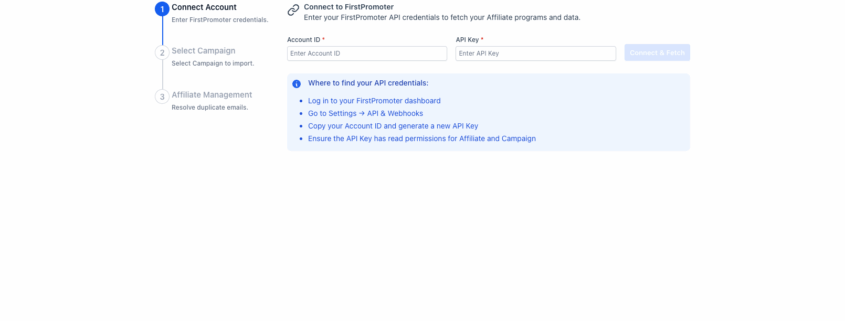 - Step 1: Connect Account – Enter your FirstPromoter Account ID & API Key. Helpful inline instructions guide you to retrieve credentials from your FirstPromoter dashboard.