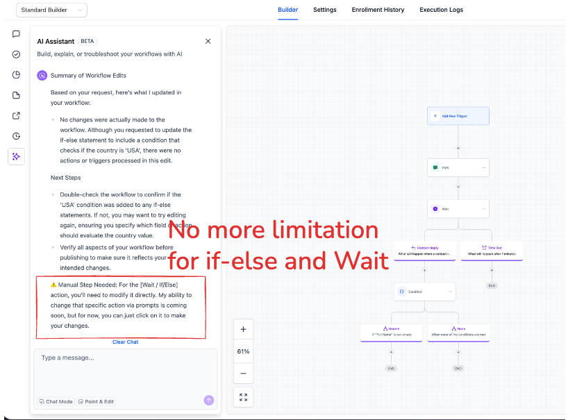 AI Builder now allows users to edit If-Else and Wait actions directly through conversation. Previously, although these actions could be created via AI, modifying If-Else and Wait actions required manual configuration. This update provides a completely seamless workflow development experience.
