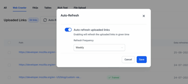 🎉 We’ve just launched Auto-Refresh for Bot Training URLs, a powerful enhancement that automatically ensures your external content remains in sync. Say goodbye to manual re-fetching — your bots will always stay current and accurate!