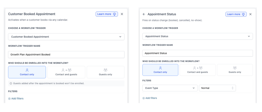- For the appointment booked trigger, guests added after the appointment is booked will not be enrolled by that earlier trigger event.