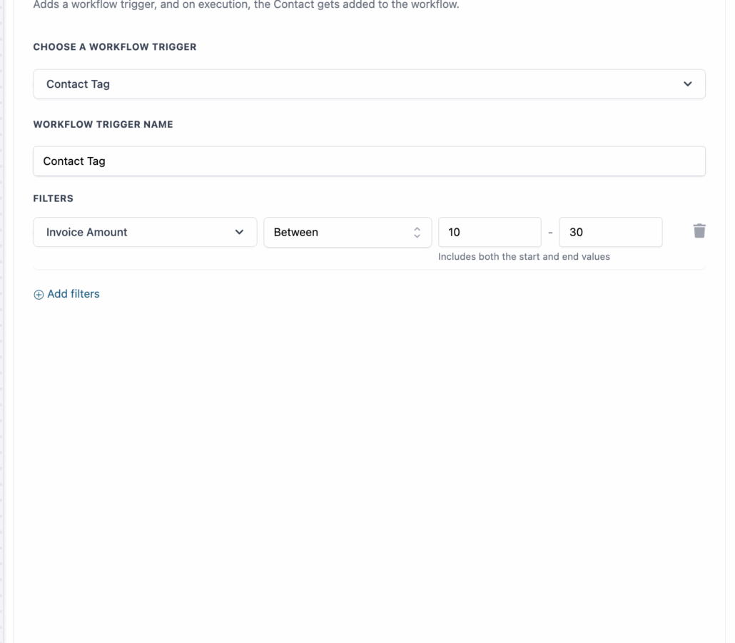 We have introduced a “Between” operator for workflow trigger filters, which allows you to filter values within a specific numeric range using a straightforward two-field input.