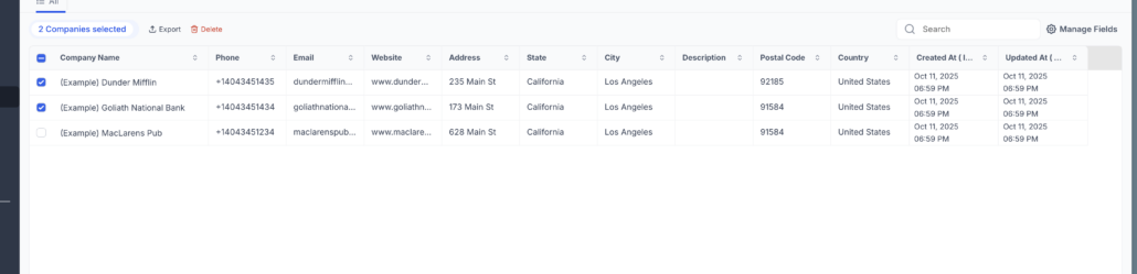 You have the option to export all companies from the 3-dot menu (top-right) and can monitor the export progress in real time with a modal displaying the record count and percentage completion. The download will be in CSV format, containing all selected company fields.