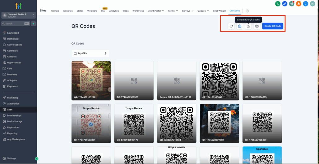- Click “Create Bulk QR Codes” in the QR Codes section.