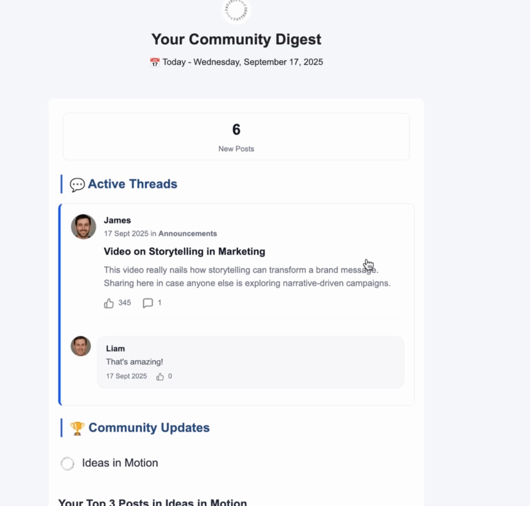 - Re-engagement made easy: Members return to the community naturally, without extra nudges.