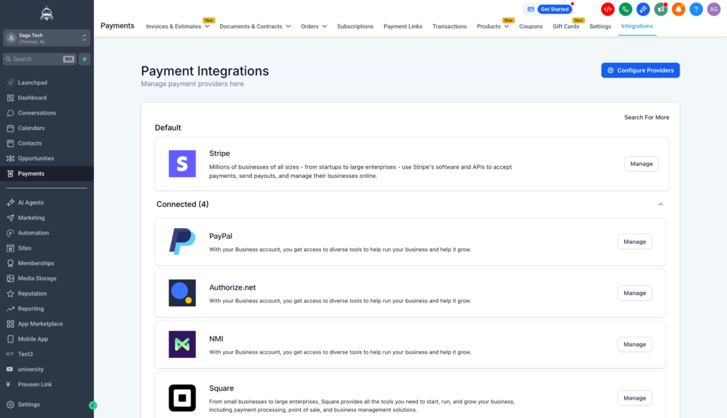 - Specific channels will soon have the capability to configure providers per offering. For example, Store 1 could use Stripe while Store 2 could utilise Square. This is under discussion and is planned for future expansion.