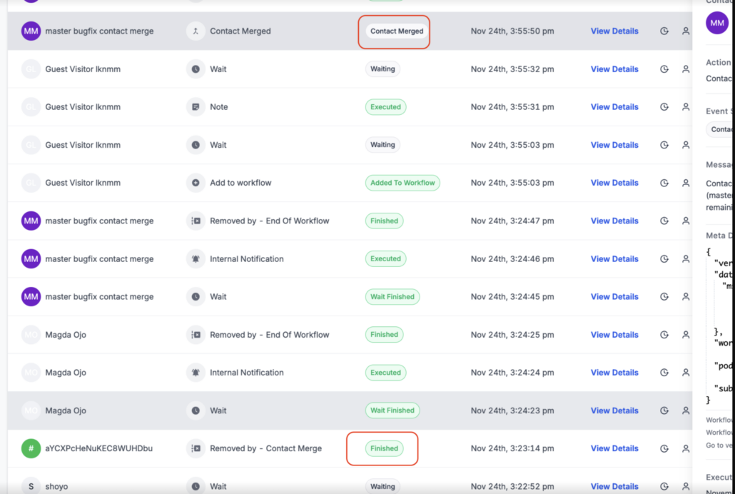 - You’ll notice a Contact Merge action recorded in the execution logs for clear traceability.
