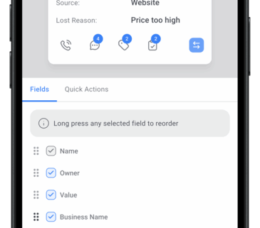 - Navigate to Opportunities → Settings → Customise Cards → Choose from 40+ fields and Quick Actions