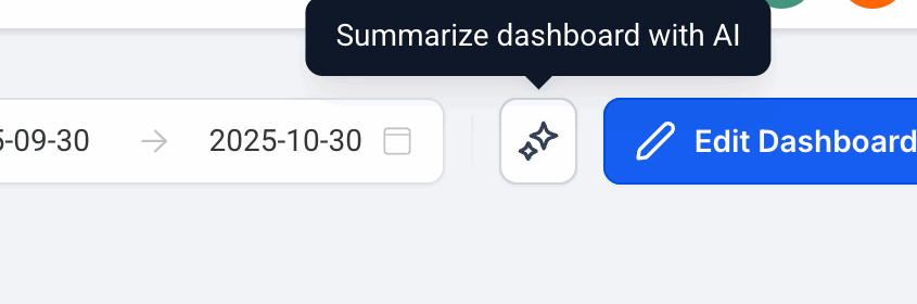 Look for the ✨ Summarise Dashboard with AI button at the top of your dashboards and experience a smarter, more actionable way to work with data. Additionally, if you hover over any widget in the dashboard, you will see an option for AI that can help you gain further insights.