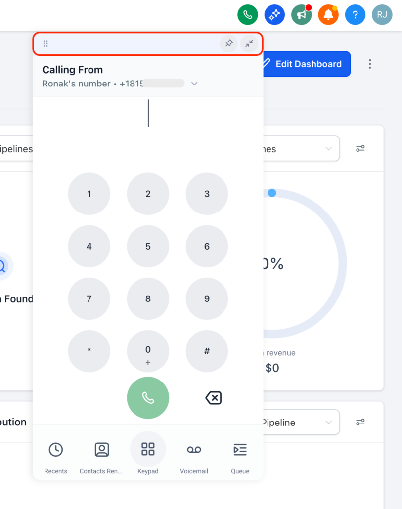 - If you’d like it to remain open, simply click the pin icon to lock the dialer in place. It will stay open until you choose to unpin it or minimise it manually.