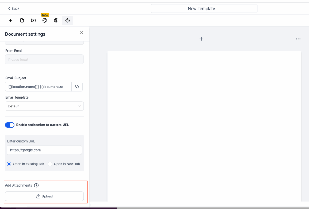 - In the left-hand “Document settings” panel, find “Add Attachments” and click “Upload.”