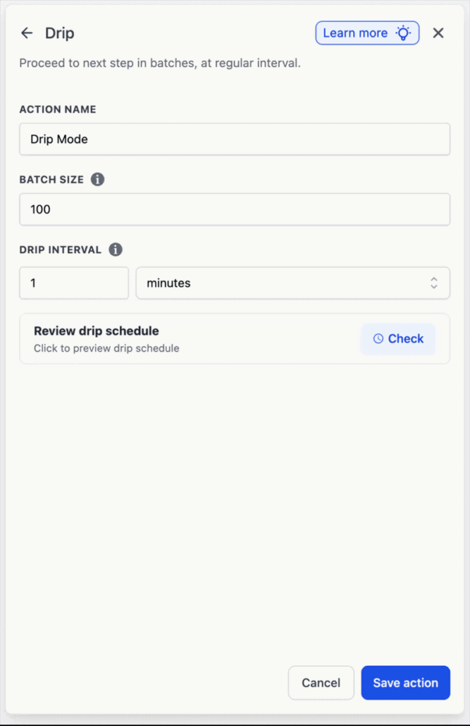 A live schedule preview is now available within the Drip action during configuration, allowing users to see exactly when each batch is expected to run before publishing.