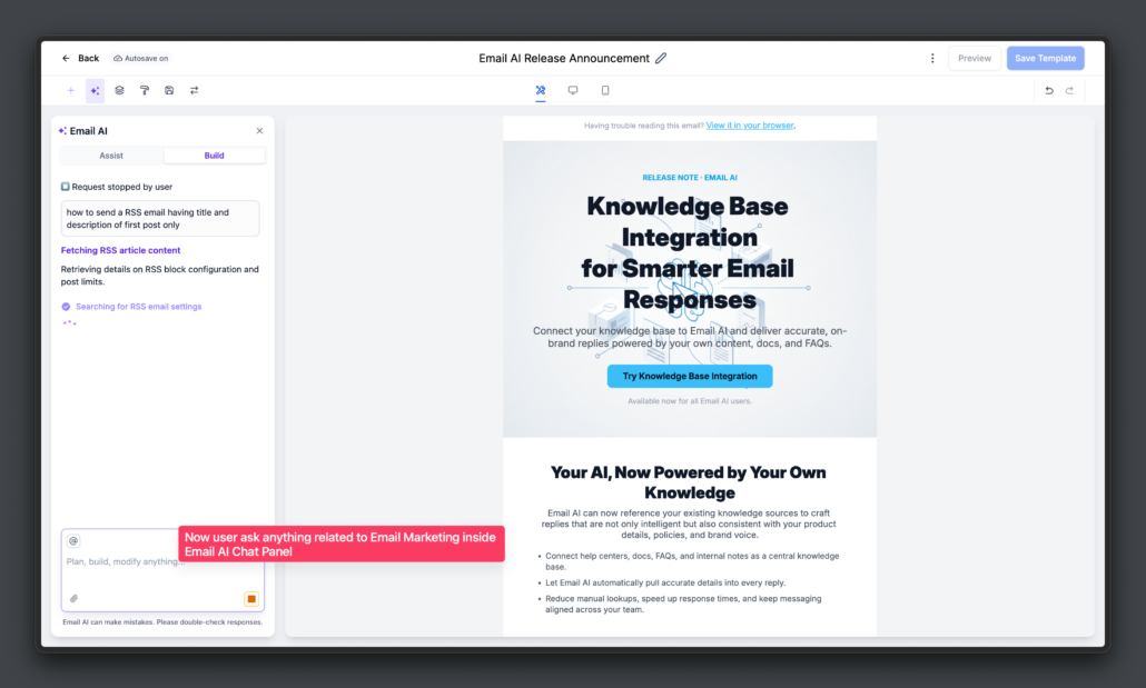 Email AI can now utilise the Knowledge Base to generate more accurate and helpful responses based on available help articles.