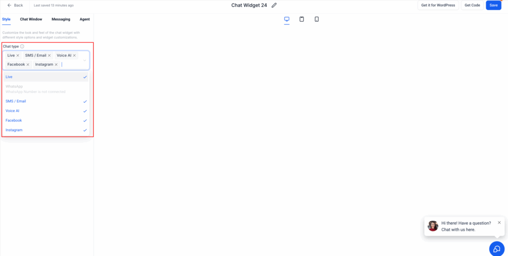 - Navigate to Sites > Chat Widget > Open an existing or create a new All-in-One Chat Widget > Style tab.