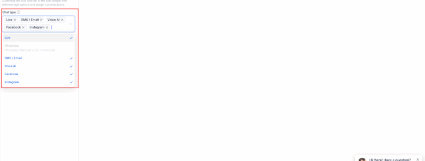 The All-in-One Chat Widget now supports Facebook, Instagram, and Voice AI as selectable communication channels alongside the existing options.