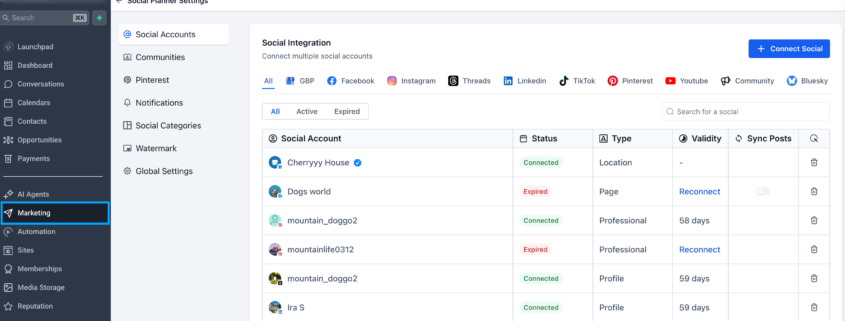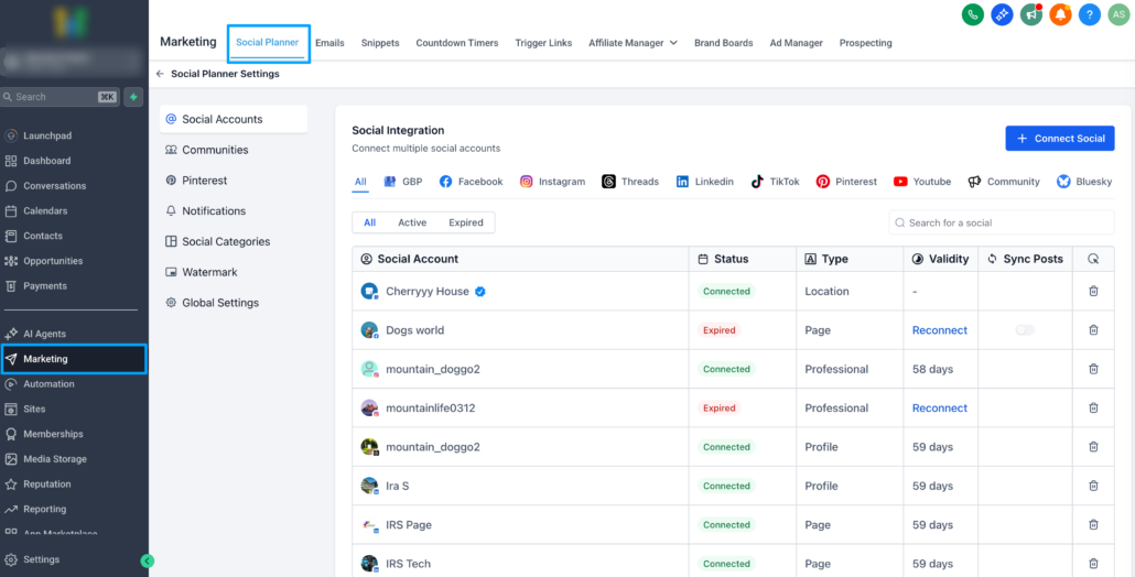 - Go to Marketing → Social Planner → Settings.