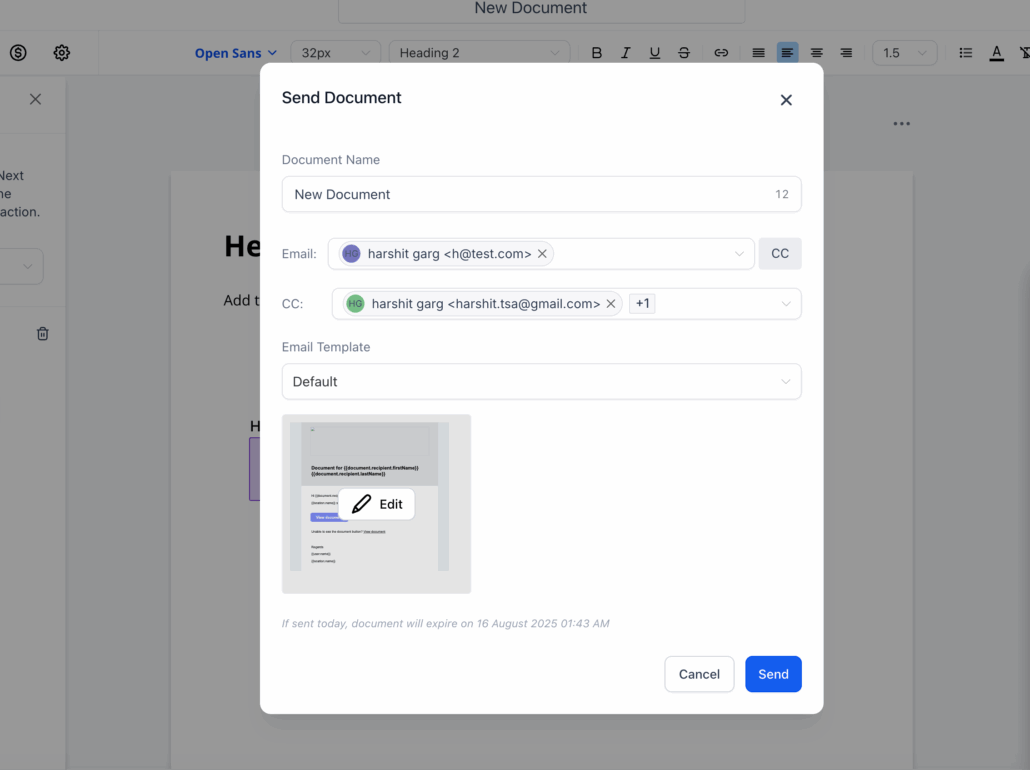 The Edit icon is now permanently displayed on the document send modal screen. This means users can easily identify where to click if they wish to modify the email before sending it.