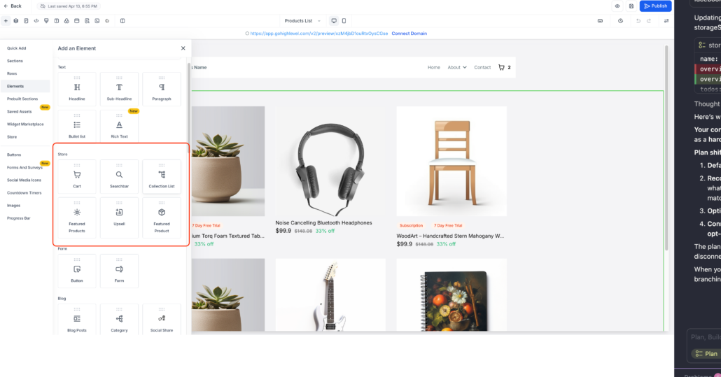 - If a store exists in your sub-account, you will see Store Elements ranked at the top of the panel.
