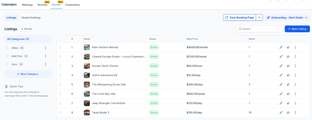 Rentals is a powerful new addition to Clixio’s scheduling suite, specifically designed for businesses managing bookable inventory, such as equipment, vehicles, venues, holiday properties, event setups, and more.
