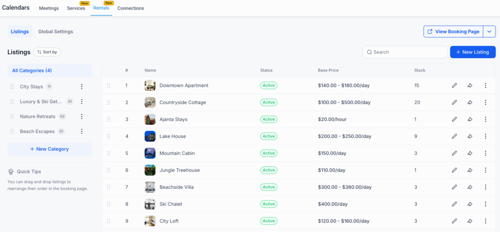 - Provide customers with a streamlined booking experience using a dedicated public-facing booking page that showcases your listings, categories, pricing, and availability in real-time.