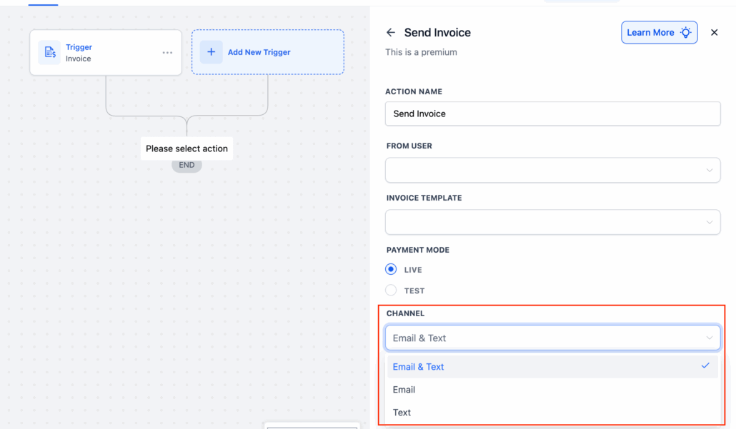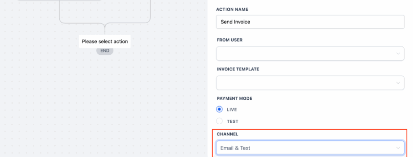 - Open your Workflow in the Automation Builder and add (or edit) a Send Invoice, Send Estimate, or Send Recurring Invoice action. Scroll down to the Channel field highlighted below: