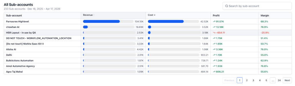 <li>Sort by revenue or cost to quickly identify significant or high-risk sub-accounts</li>