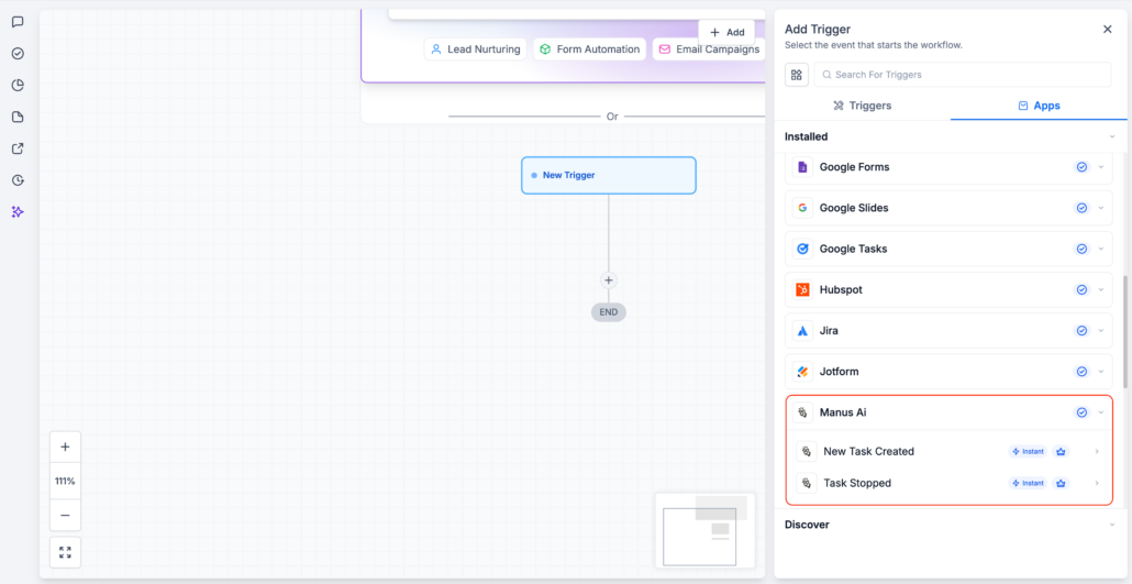 - Add a Manus trigger or action