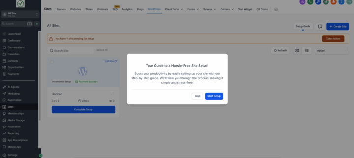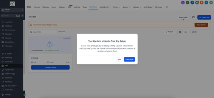 - Existing WordPress Site: Go to Sites → WordPress Dashboard → Go to Site → Setup Guide