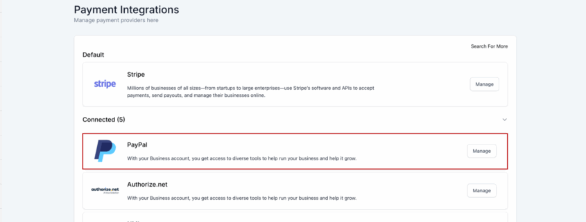 - PayPal can be used individually or alongside Stripe, NMI, Square, and Authorize.net.