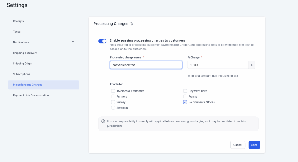 - Navigate to Payments → Settings → Miscellaneous Charges → Processing Charges.