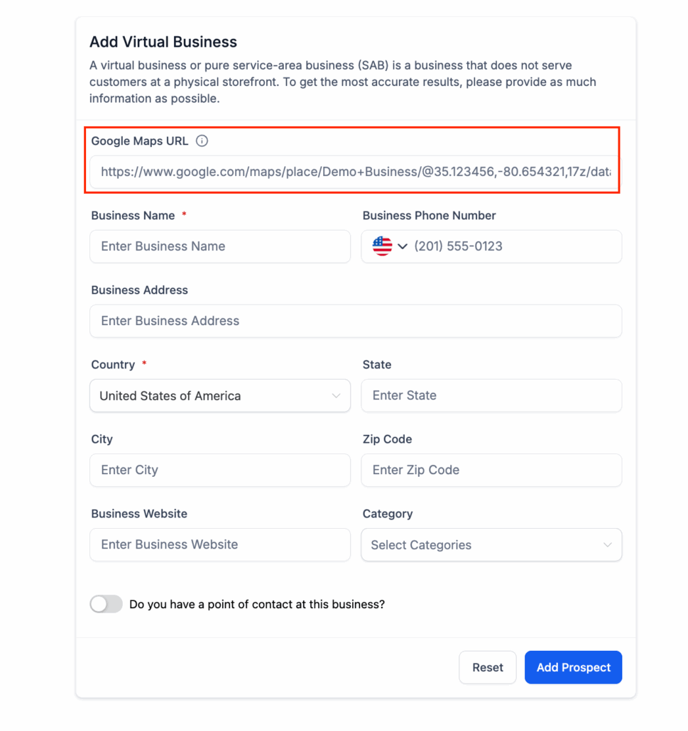 Earlier this week, some users encountered difficulties when trying to add virtual or service area businesses (SABs) in the Prospecting Tool. The process was temporarily halted due to technical issues related to fetching Google Business data for these prospects.