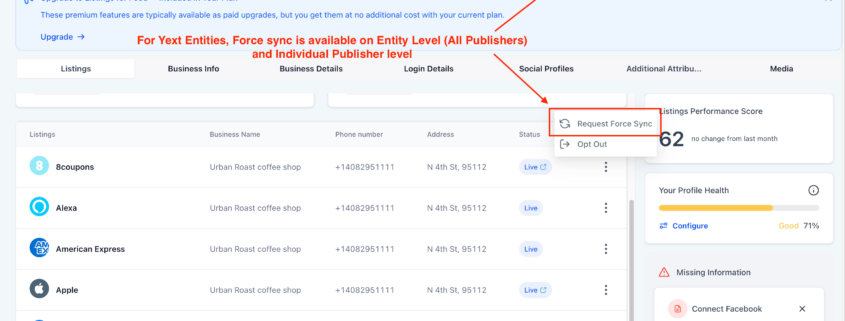 We are excited to introduce Force Sync — a powerful new capability that enables users to manually prioritise their business listing updates across publishers. This feature is particularly beneficial when updates are stuck or delayed for an extended period. Force Sync signals the listing engine to prioritise the update process, helping to expedite updates that would otherwise take weeks to process.
