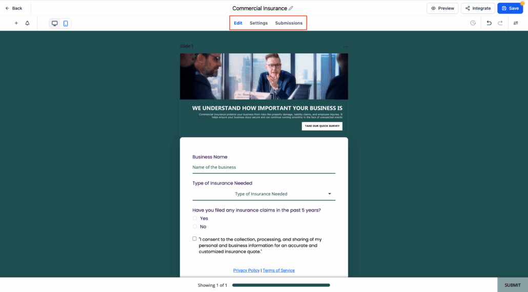 - Use the top navigation tabs — Edit, Settings, and Submissions — to manage each aspect of your form, survey, or quiz.