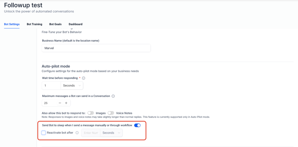 - Enable “Send Bot to sleep when I send a message manually or through workflow”