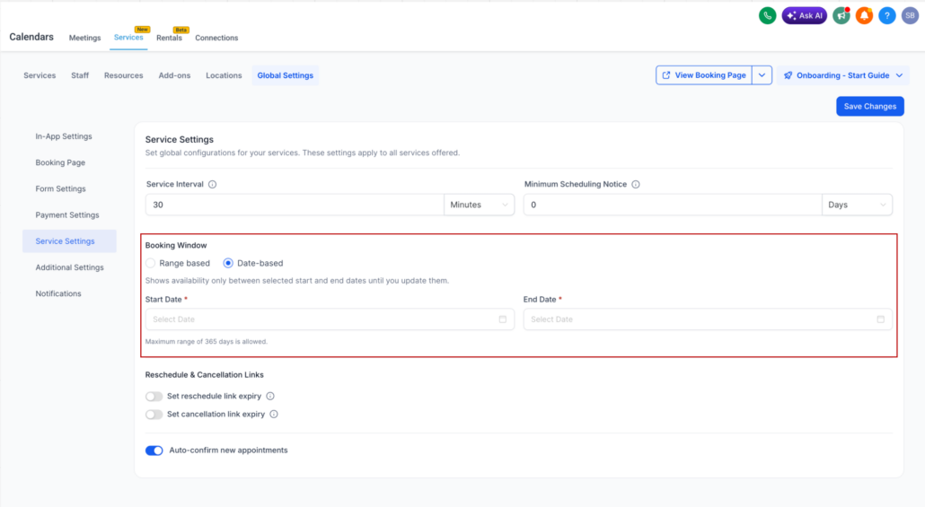 - Select between a Days-based or Date-based booking window.