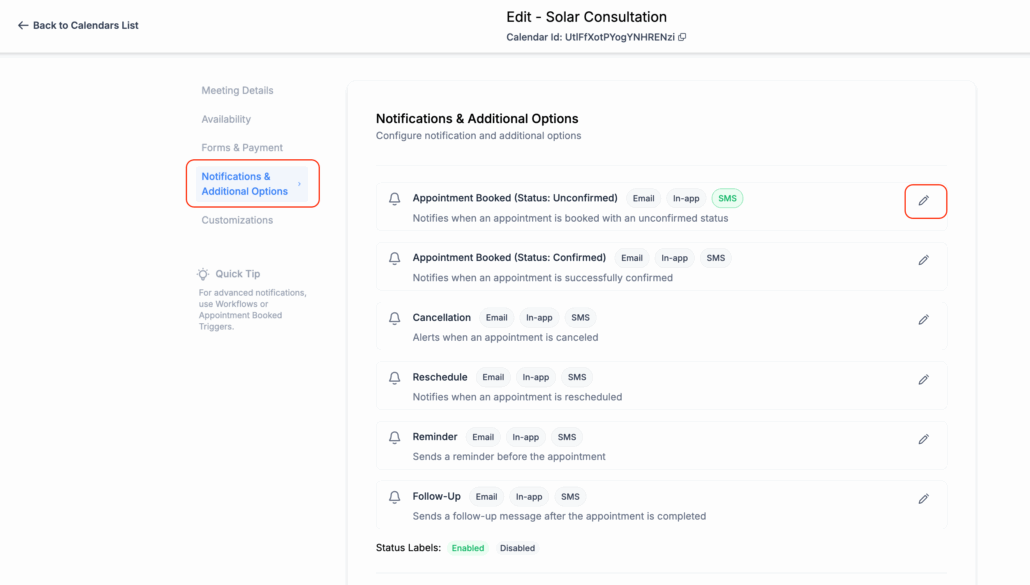 — Appointment Unconfirmed, Confirmed, Cancelled, Rescheduled, Reminder, and Follow-up — across both Calendars and Services.