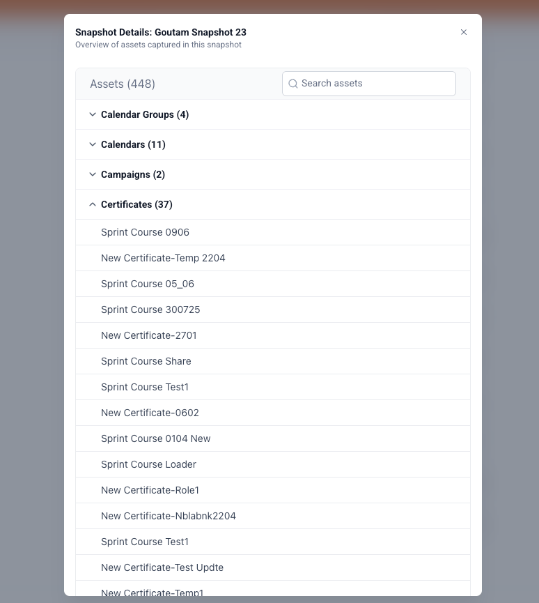 Clicking on a snapshot now opens a detailed list of all the assets it contains.