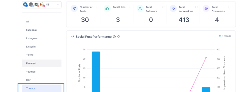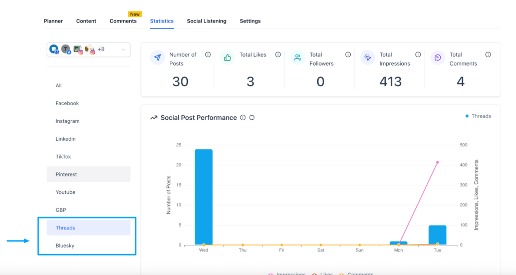 Analytics for Threads and Bluesky are now fully supported, providing visibility into these two fast-growing platforms directly within Social Planner.