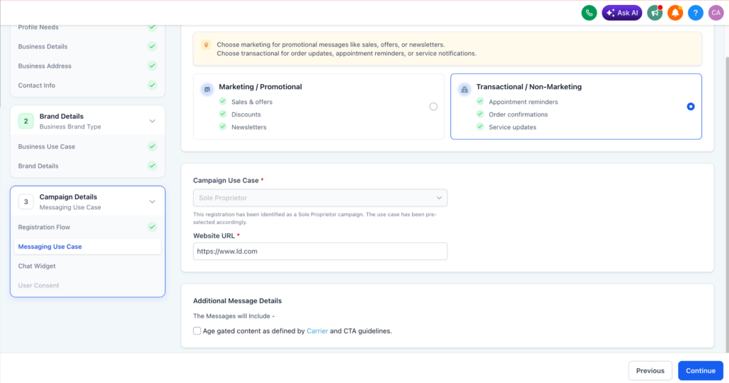 - Sole Proprietor registrations are now automatically detected within the Chat Widget flow. When identified, the campaign use case is pre-selected.