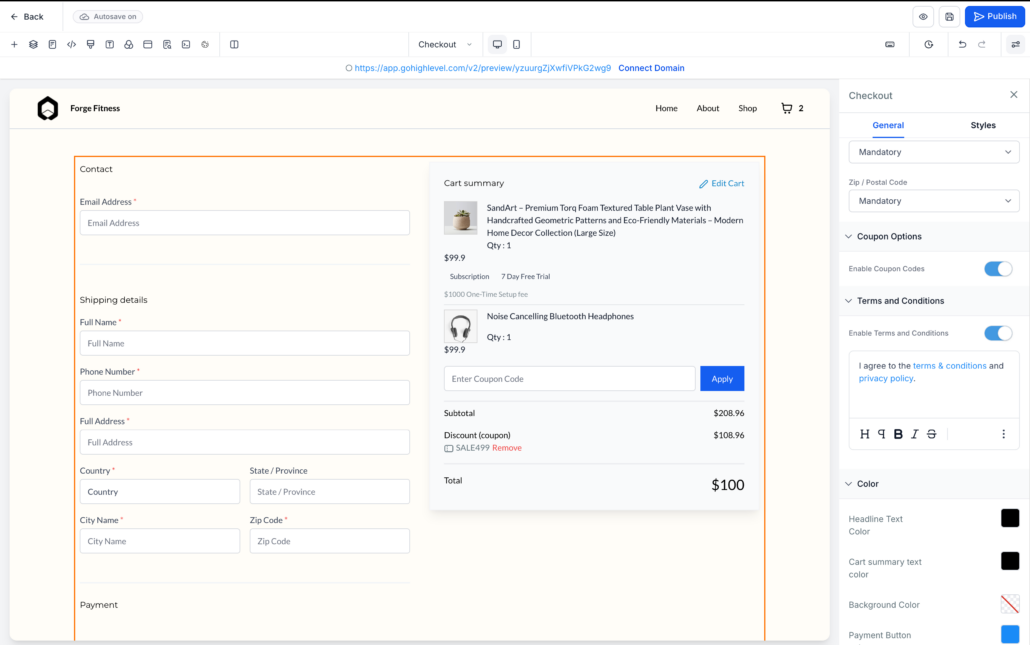 Easy Toggle in Builder: Enable or disable “Terms and Conditions” directly from the Checkout element settings.