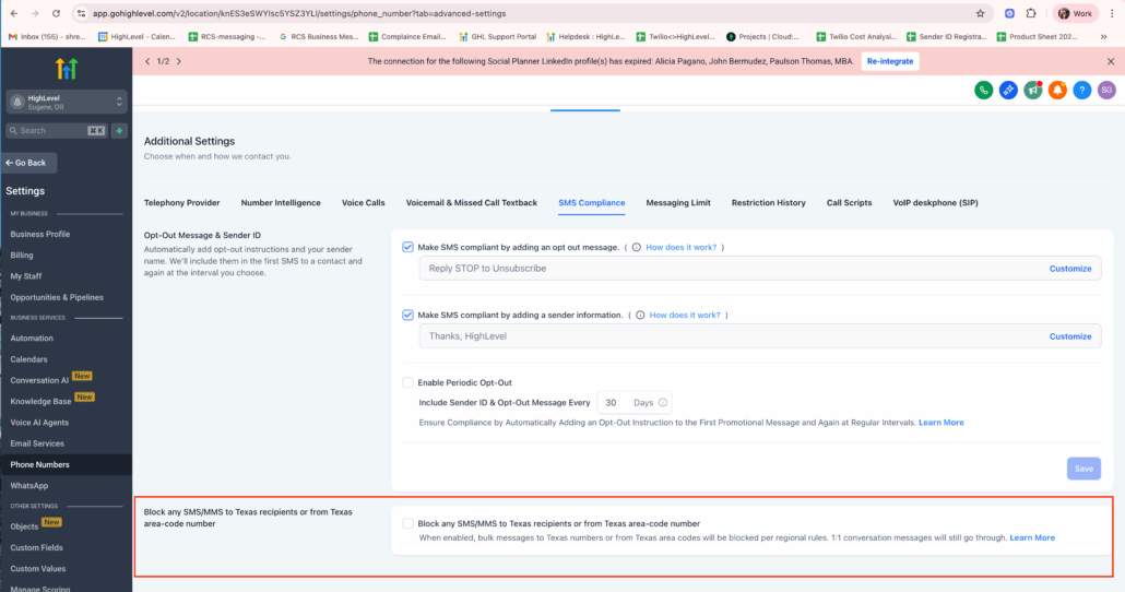 Settings → Phone Numbers → Additional Settings → SMS Compliance → Texas SMS Safeguard