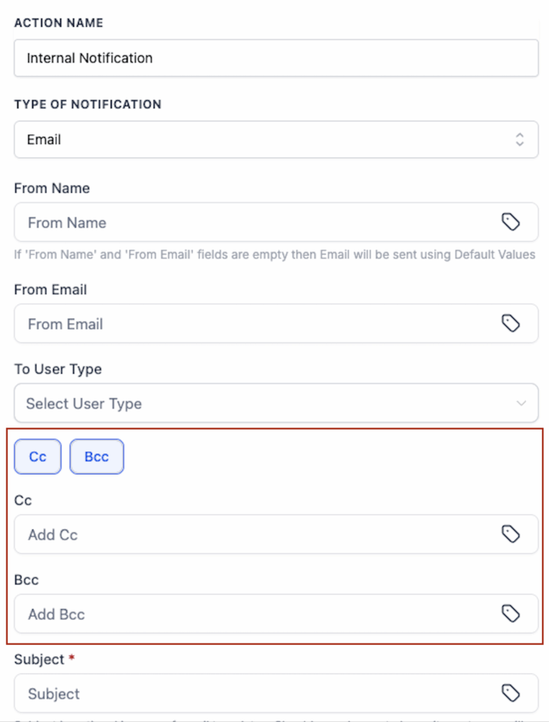 We have enhanced the Internal Notification action within Workflows by adding cc/bcc support for emails — a feature that has been highly requested by our customers.