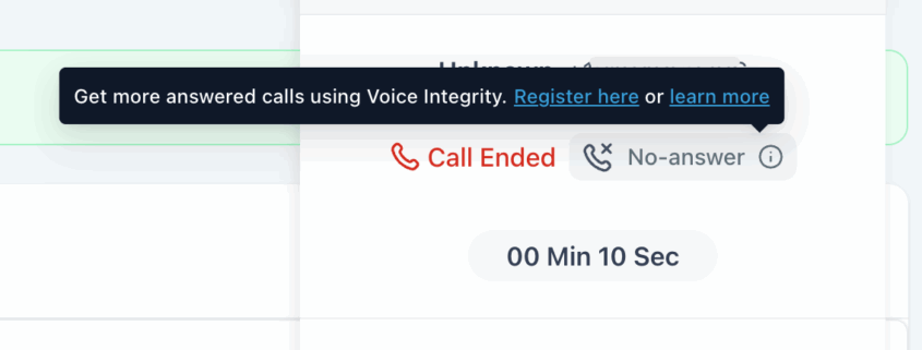 Helping increase Call Answer rates: Voice Integrity tooltip on unanswered calls