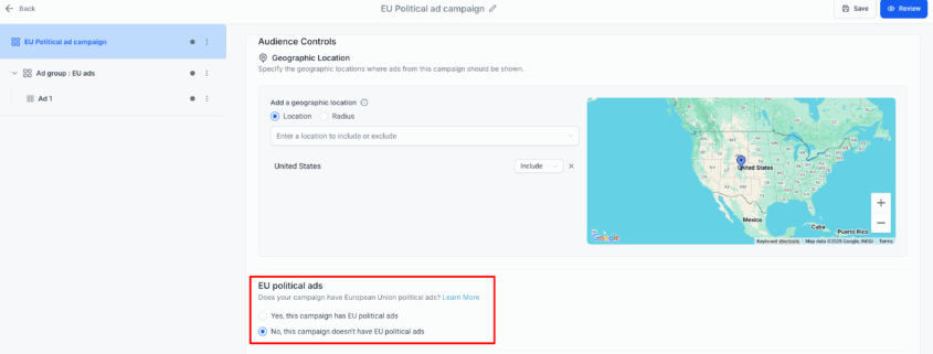 Google Ads: EU Political ads compliance section
