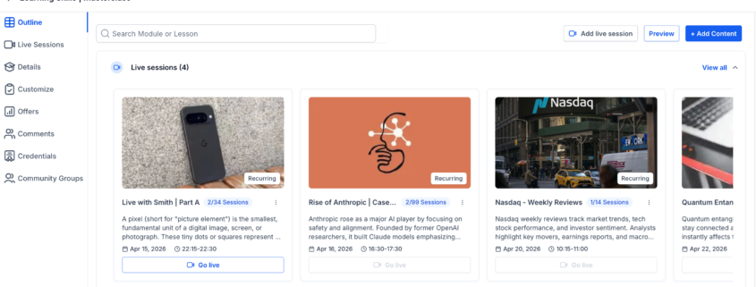 Live Sessions in Courses simplify the planning, hosting, and reuse of live learning — all from a single platform. Whether it’s one-off classes or recurring series, creators can easily conduct live experiences directly within their courses. 📅 Flexible Session Scheduling Creators can now schedule both one-off sessions and recurring series directly within a course. Recurring […]