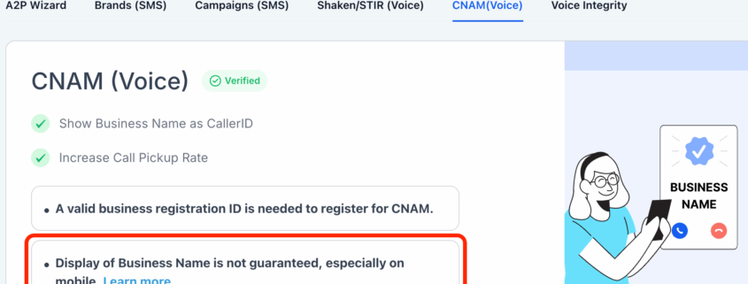 /in What's New?27th August 2025 Setting the Right Expectations for CNAM We have updated the CNAM registration screen to clarify how Caller ID Name (CNAM) operates. Access the CNAM registration screen through sub-account Settings > Phone Numbers > Trust Center > CNAM (Voice). No changes have been made to the operation of CNAM. Our aim was to […]
