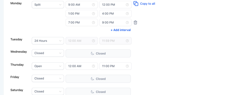 /in What's New? Dashboard, Opportunities and PipelinesWe’re excited to introduce Split Business Hours — a highly requested feature that provides you with complete flexibility in managing your business operating hours directly within the Clixio dashboard. No more switching to external platforms for complex schedules! Previously, our Listings product only supported a single continuous opening time each day. Now, you can configure […]